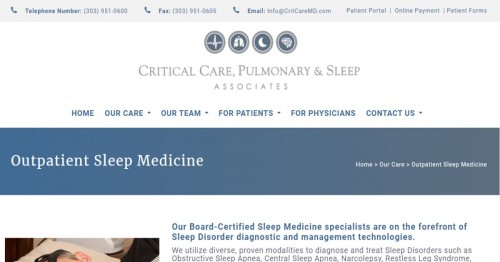 Summary: Critical Care, Pulmonary and Sleep Associates is located at 274 Union Blvd, No.200 in Lakewood, Colorado, 80228. It is categorized as Sleep Clinic, Sleep Therapy, Sleep Medicine and it offers medical services for Pulmonary Medicine, Sleep Medicine, Sleep Apnea, Insomnia, Narcolepsy and Sleep Disorders Treatment.