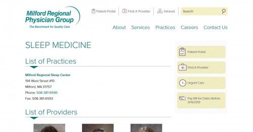 Summary: Milford Regional Sleep Center is located at 194 West Street, No.10 in Milford, Massachusetts, 01757. It is categorized as Sleep Clinic, Sleep Therapy, Sleep Medicine and it offers medical services for Sleep Apnea, CPAP Therapy, Insomnia, Narcolepsy and Sleep Disorders Treatment.