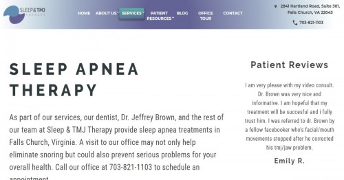 Summary: Sleep & TMJ Therapy is located at 2841 Hartland Road, Suite 301 in Falls Church, Virginia, 22043. It is categorized as Dentist and it offers dentistry services and oral appliances for sleep apnea treatments.