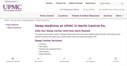 Summary: Susquehanna Health Sleep Center is located at 1100 Grampian Blvd in Williamsport, Pennsylvania, 17701. It is categorized as Sleep Clinic, Sleep Therapy, Sleep Medicine and it offers medical services for Obstructive Sleep Apnea, Narcolepsy, Excessive Daytime Drowsiness, Abnormal Night Time Behaviors, Restless Leg Syndrome, and All Sleep Disorders.